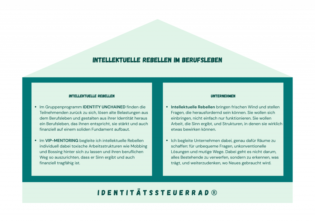 Das Identitätssteuerrad® bildet das Fundament meines Mentorings: Es ist das Navigationssystem für alle intellektuellen Rebellen, die in keine Schubladen passen (wollen). Es zeigt ihnen, wer sie wirklich sind, stärkt sie darin, ihr einzigartiges Wesen zu leben und führt sie mutig auf ihrem eigenen Weg. Je nach Format setze ich es vollständig oder in Auszügen ein.